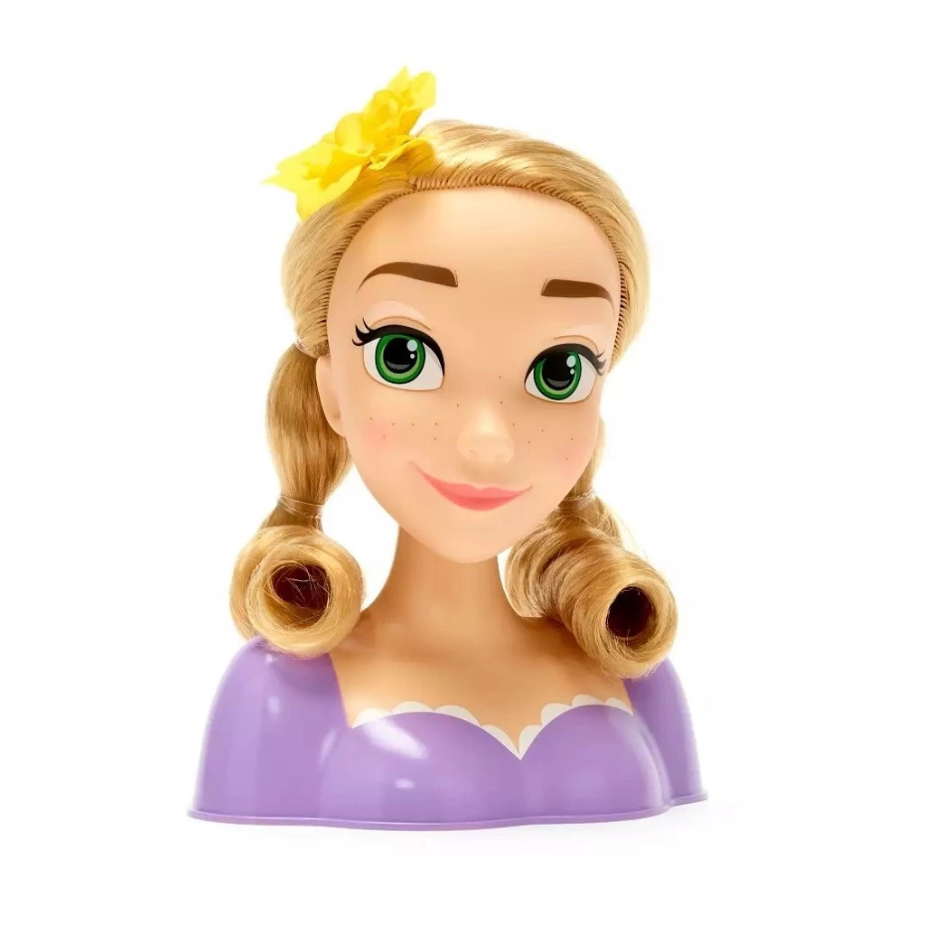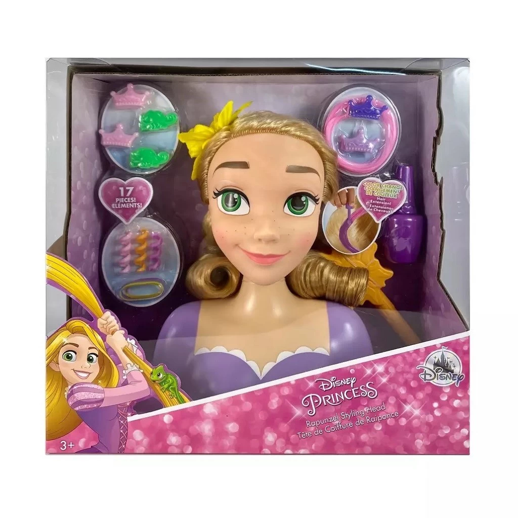 Include: testa da pettinare di Rapunzel , spazzola, elastici, 6 mollette, 3 bigodini, extension per capelli, e 1 cambia colore per extension